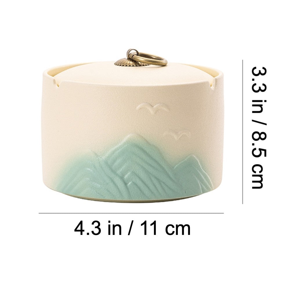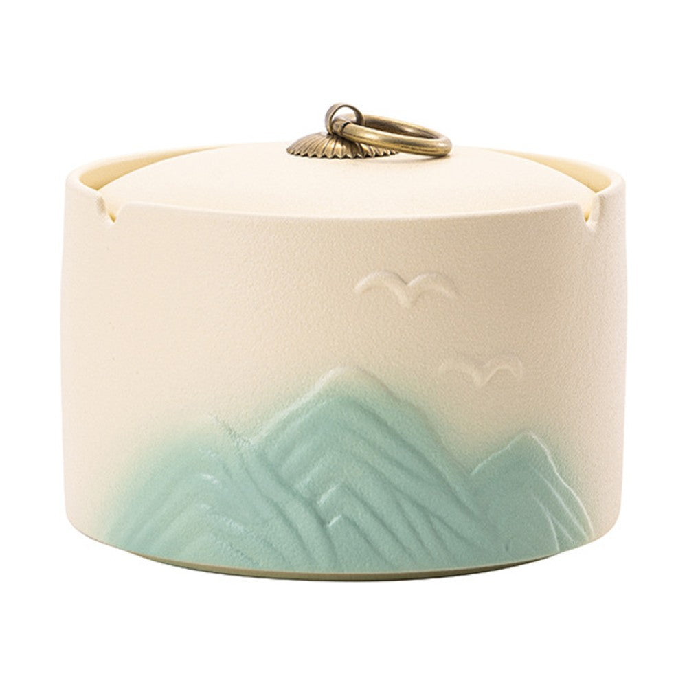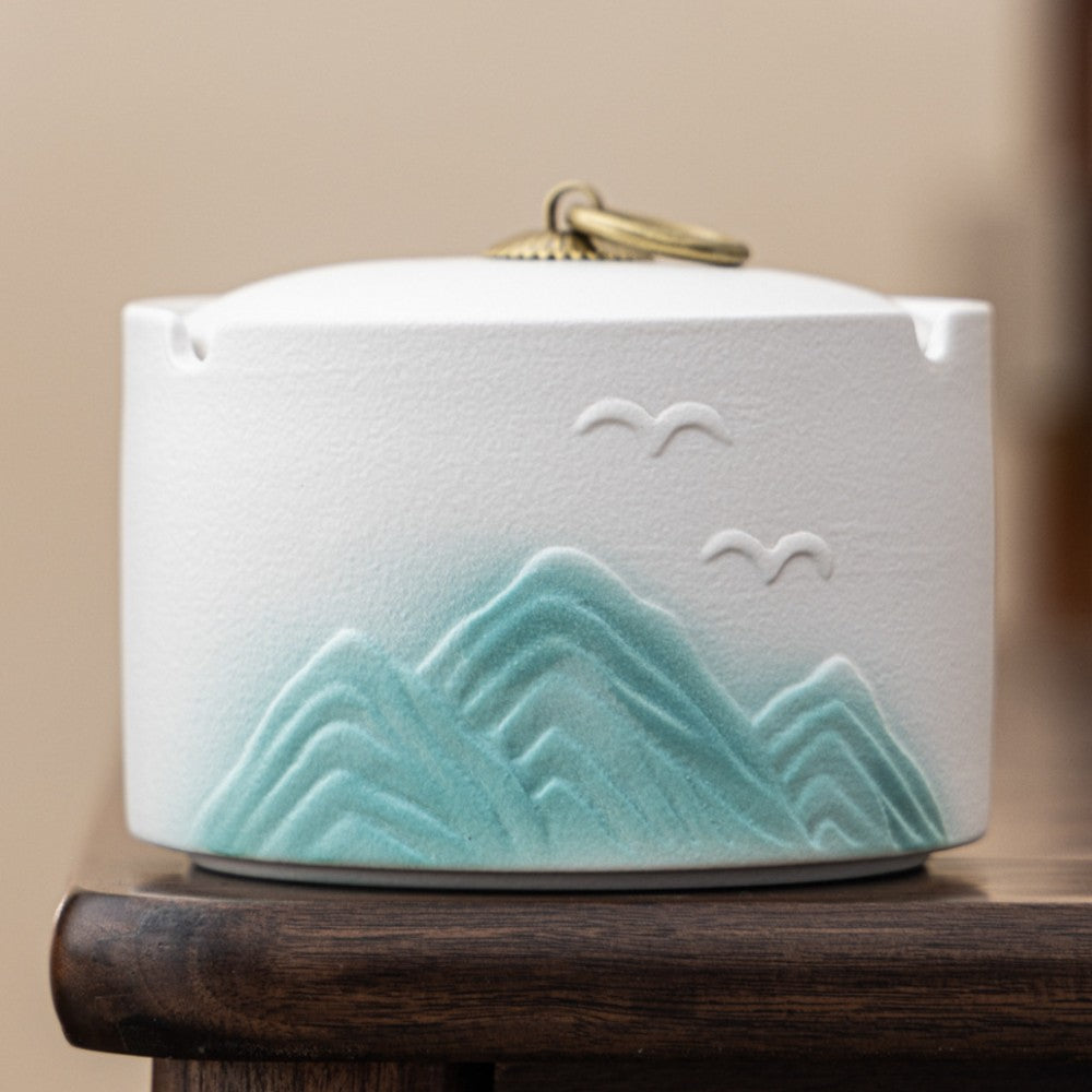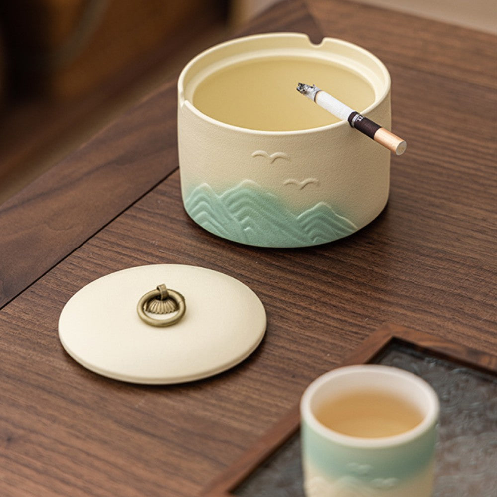 Bring calm and elegance to your smoking space with this beautifully crafted Japanese ceramic covered ashtray. Inspired by serene mountain landscapes and minimalist Japanese aesthetics, this ashtray blends artistic design with practical functionality. The soft gradient mountains, delicate bird motifs, and matte ceramic finish create a peaceful visual that elevates any table, patio, or smoking corner.