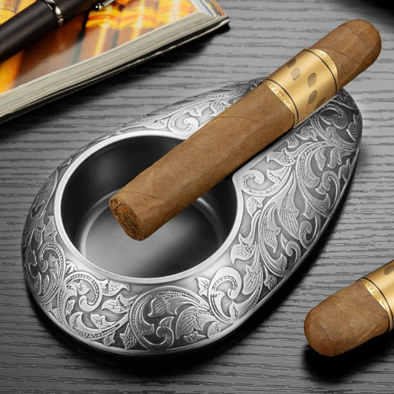 Elevate your cigar ritual with this luxury engraved cigar ashtray, crafted from solid alloy and finished with intricate Baroque-inspired patterns. Designed for both style and function, its wide bowl and dedicated cigar rest make it a refined centerpiece for any desk, lounge, or cigar room.