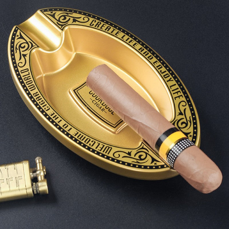 Enjoy your cigar in style with this bold, oval cigar ashtray featuring classic typography and a refined luxury finish. Designed with dual cigar grooves, it comfortably holds two cigars while keeping ash neatly contained. The smooth resin body, elegant curves, and statement colors make it ideal for home lounges, offices, cigar rooms, or as a standout gift for cigar enthusiasts.